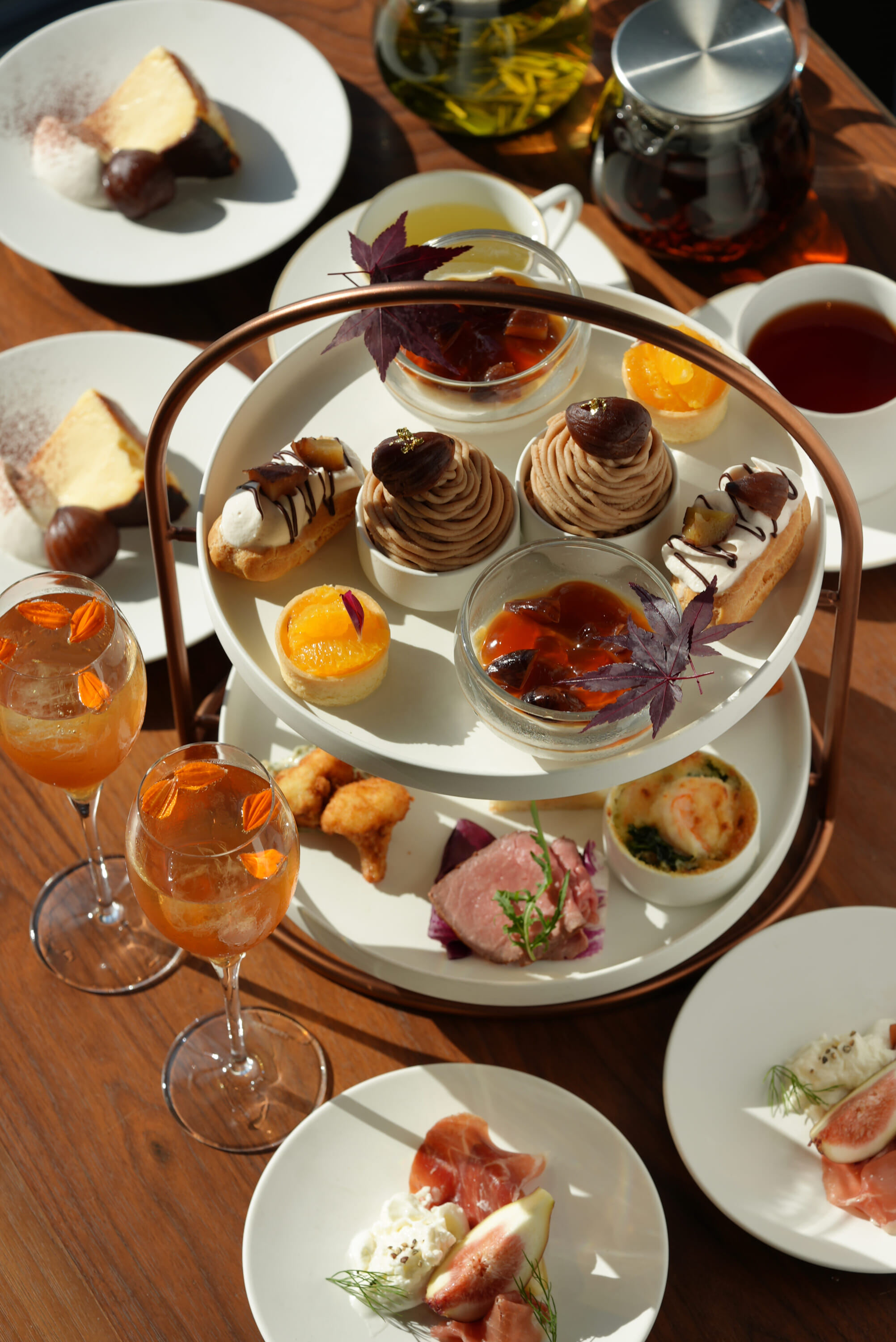 The colorful tones of Tokyo Node Dining’s afternoon tea set evoke the feeling of late autumn. There are four kinds of sweet and four kinds of savory dishes. Including in the former is a Mont Blanc dessert using Japanese chestnuts from Aso with a mellow and elegant flavor, a rich chestnut panna cotta with bergamot-scented Earl Grey jelly, a bittersweet cream puff with chestnut and caramel and a refreshing mandarin orange tart.