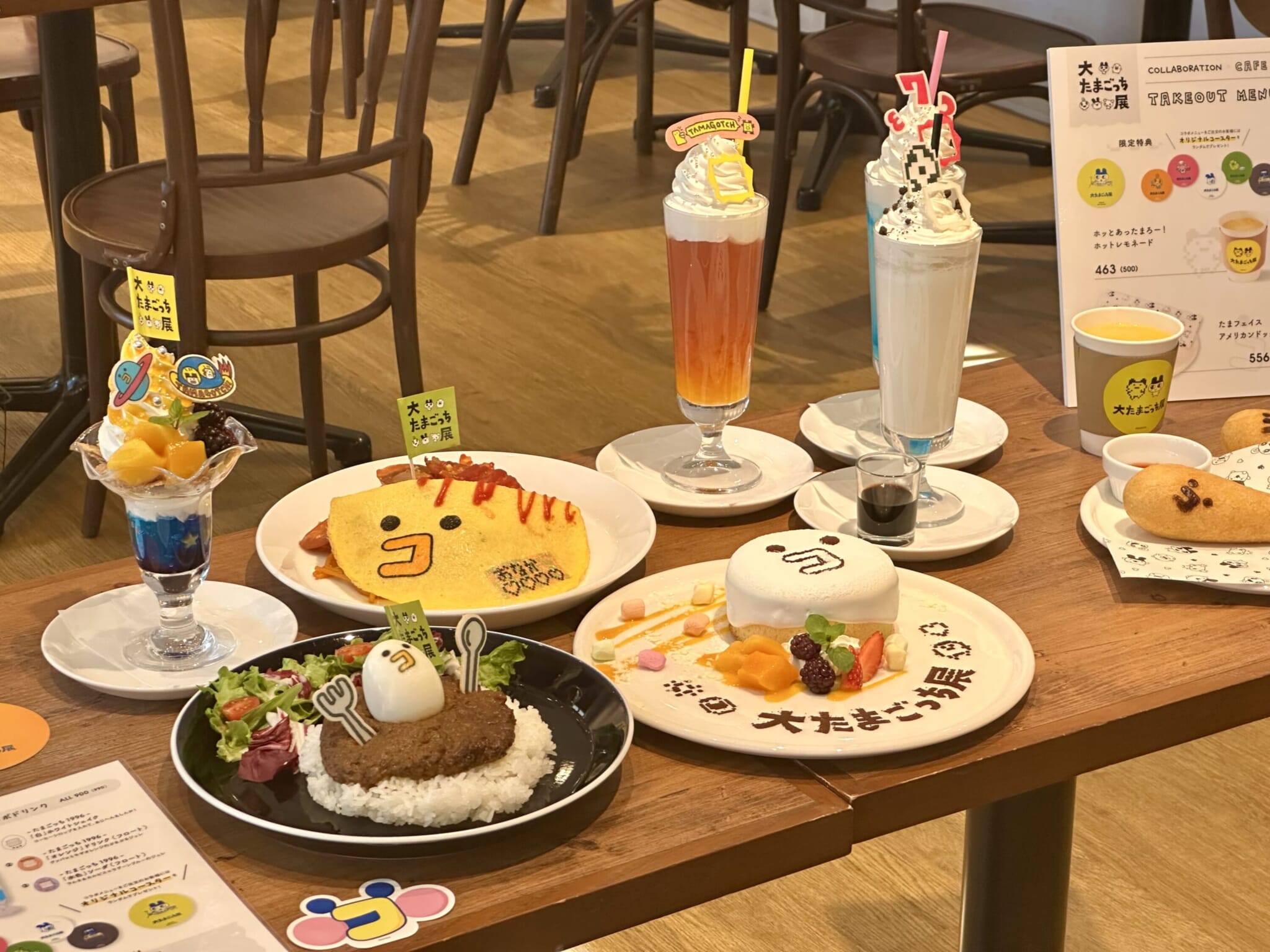 The exhibition’s collaboration cafe features a fun menu inspired by Tamagotchi. The cafe space is decorated with Tamagotchi faces at every corner and the theming continues with cutely decorated food and drinks to wrap up guests’ museum visit. The menu includes keema curry, omurice, pancakes and a parfait. The cafe also offers a takeout menu, offering hot lemonade and corn dogs. Guests who order from the cafe will receive a random Tamagotchi coaster.