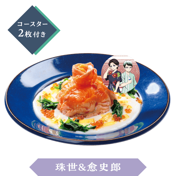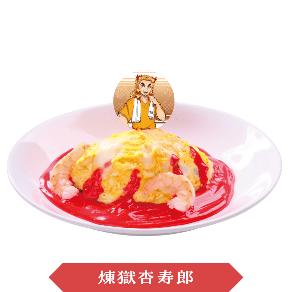 Entrées include Zenitsu’s chili shrimp rice bowl, Rengoku’s omelette rice, Inosuke’s burger, Kanao and Shinobu’s chirashi sushi, Tanjiro’s garlic tomato pasta and Tamayo and Yushiro’s doria-style salmon plate. Inosuke’s burger and Tamayo and Yushiro’s doria-style salmon come with two coasters.