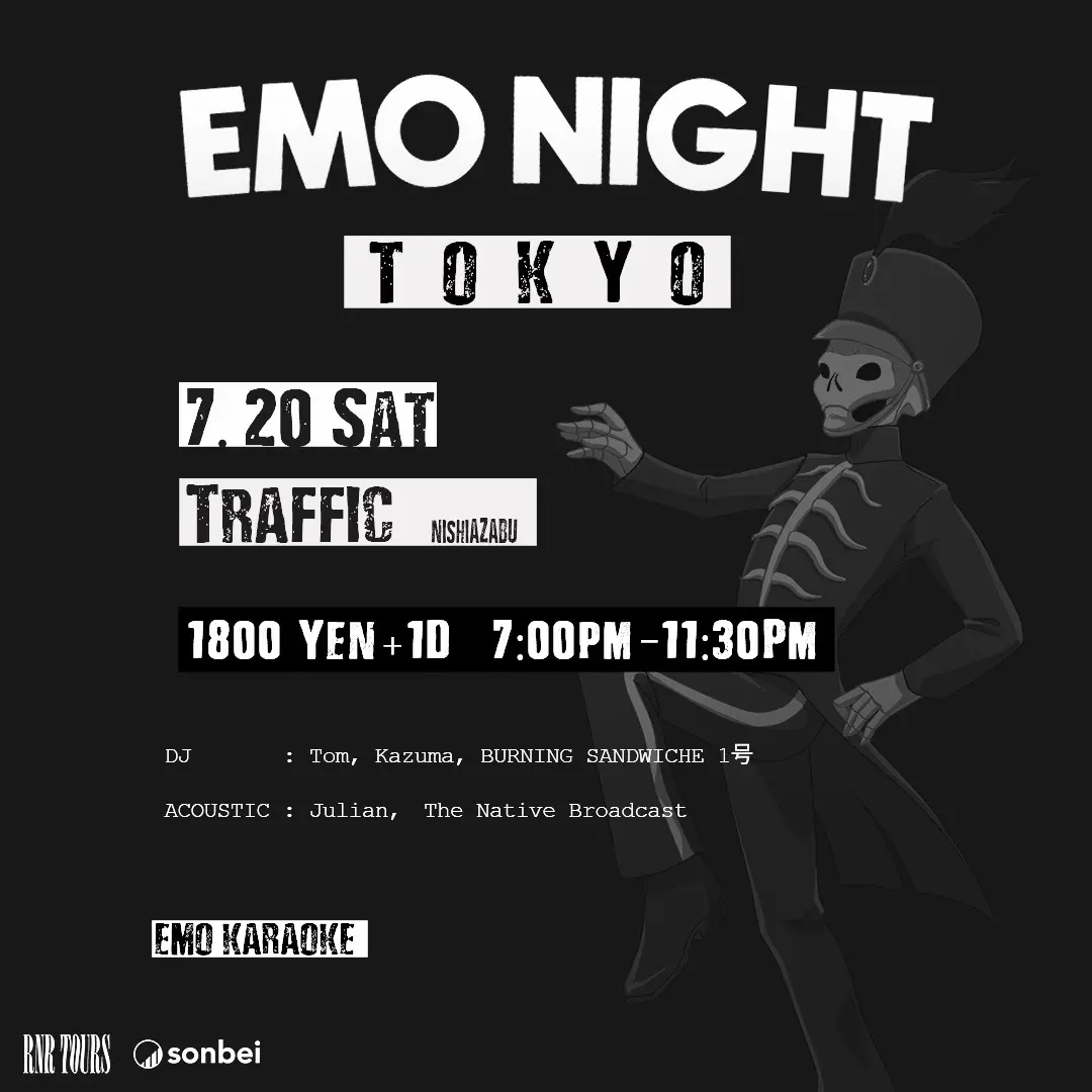 At Emo Night Tokyo, bands and DJs sing and spin tunes that resonate with your teenage soul, inviting you to sing along to our sad anthems.
