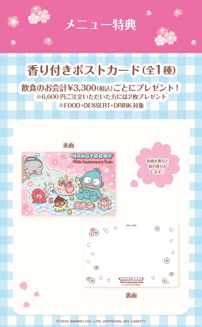 Customers who make an advance reservation will receive one of four random fans featuring Hangyodon that can be used as photo props. Customers who order menu items over ¥3300 will receive a special sakura-scented postcard.