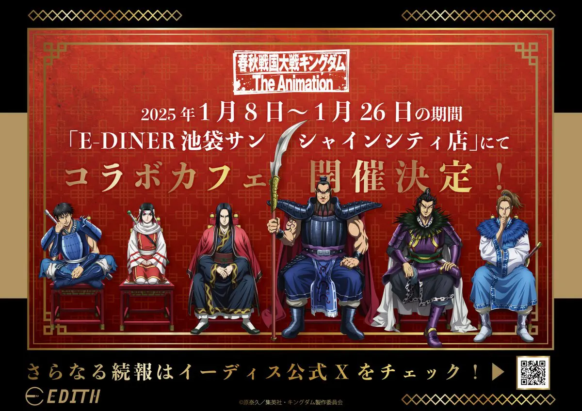 Kingdom is a huge hit in Japan, with more than 100 million copies sold. A collaboration cafe is set to take place to celebrate its success while also offering fans a space to immerse themselves in the world of the warring states. Indulge in dishes like the Kanki meat bowl and the Karyoten dumplings while also picking up some exclusive fan merchandise.