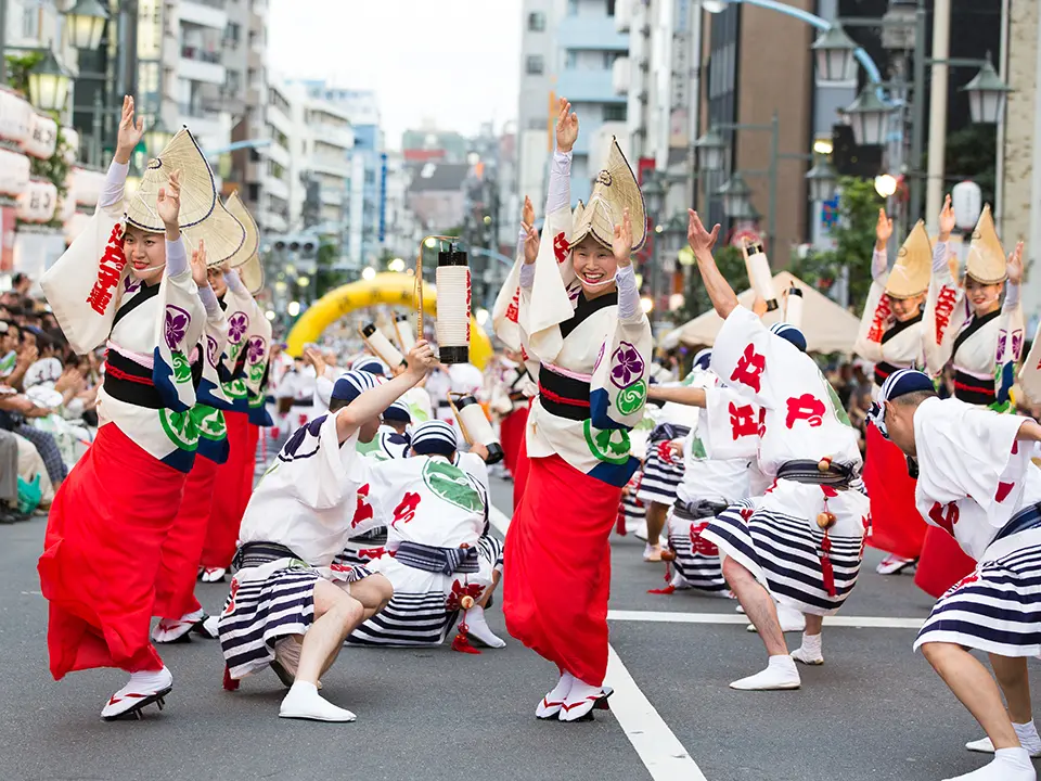 Over 100 dance groups perform at the festival every year. One of the troupes, the Kikusui group, has approximately 90 members ranging from 3 to 65 years old. Men wear happi while women wear yukata and the iconic amigasa woven grass hats that have become symbols of the event.
