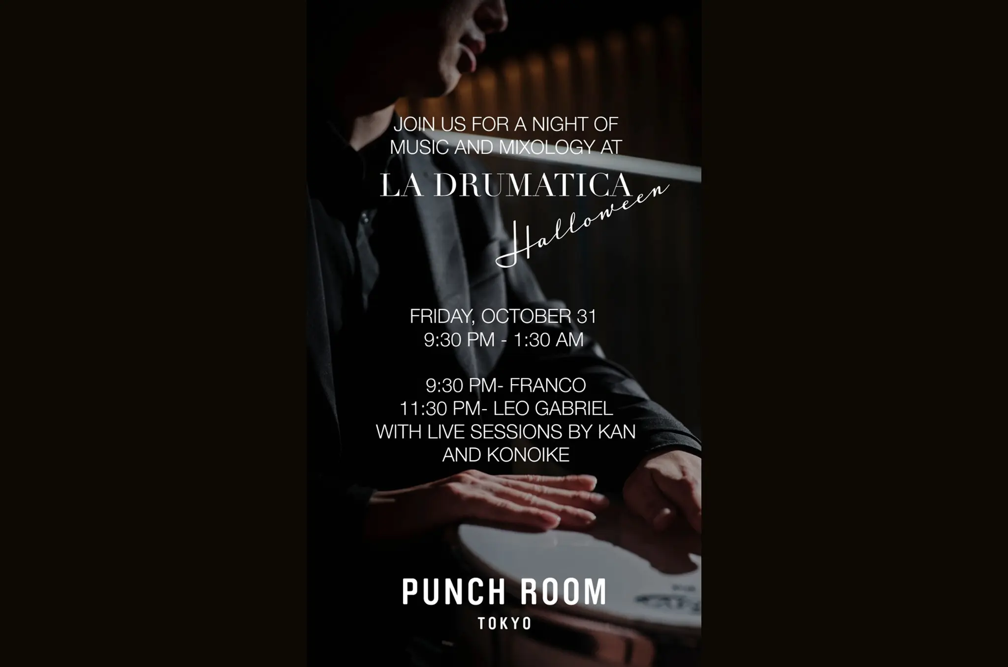 The Punch Room Tokyo bar inside The Tokyo Edition, Ginza hotel will host La Drumatica Halloween, an immersive event that will combine music and mixology. Guests will enjoy sets by DJ Franco and DJ Leo Gabriel, live percussion by Kan and a performance by reggaeton singer Konoike. Performances will be perfectly matched with exclusive craft cocktails.
