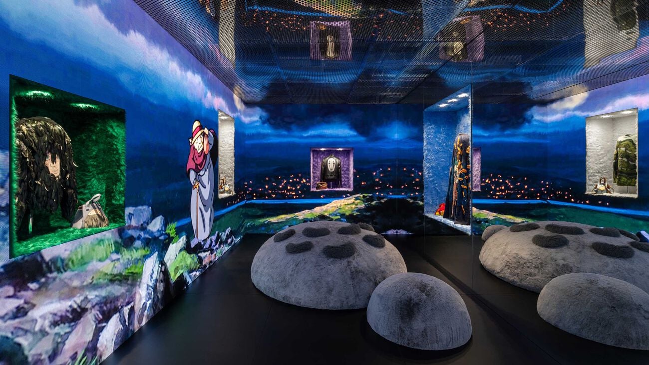Highlights include iconic designs, archival pieces and a series of interactive rooms exploring Loewe’s recent collaborations — including those of Kyoto-based ceramic studio Suna Fujita and Studio Ghibli. One room features a massive leather recreation of Howl’s Moving Castle.