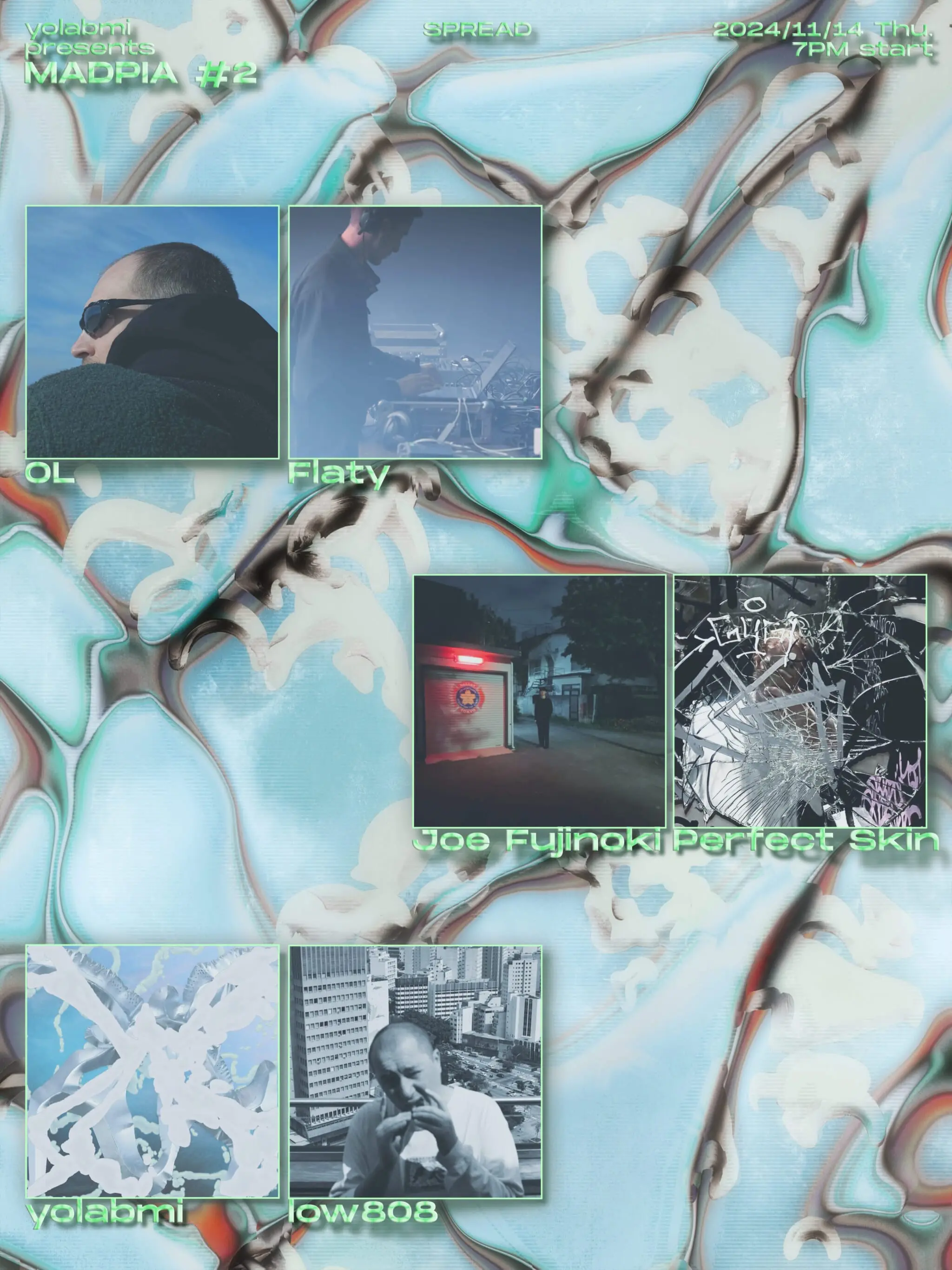Madpia#2 will feature low808, the founder of Gost Zvuk and a leading figure in contemporary Russian electronic music; OL, who has consistently released masterpieces on labels such as Gost Zvuk, West Mineral Ltd and Motion Ward; Flaty, the founder of Anwo Records and a resident artist for labels like Soda Gong, Firecracker Recordings and West Mineral Ltd; Joe Fujinoki, a synthesist who continues to evolve with each live performance and has released works on both domestic and international labels including Enmossed; and Perfect Skin, a producer and DJ from England.