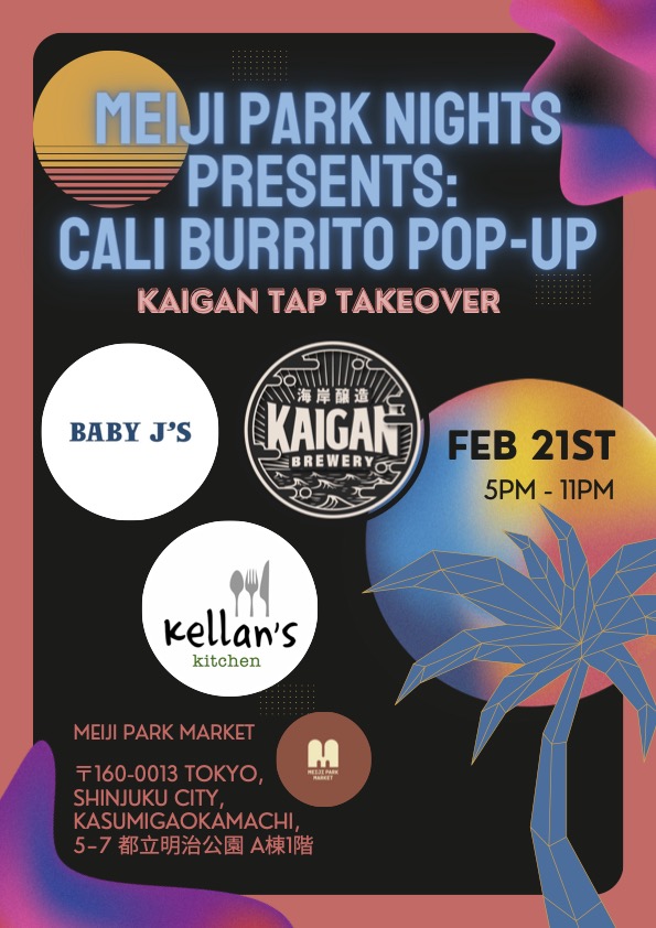 Meiji Park Market sets the stage for an exciting culinary collaboration on Friday, February 21. Kellan’s Kitchen joins forces with Baby J’s for a special California Burrito Pop-Up, bringing bold West Coast flavors to Tokyo. Adding to the experience, Kaigan Brewery takes over the taps, serving up a selection of craft brews to perfectly complement the food. Enjoy a vibrant evening of delicious bites and refreshing drinks in a lively market setting, and don’t miss this one-night-only fusion of California-inspired cuisine and Japanese craft beer.