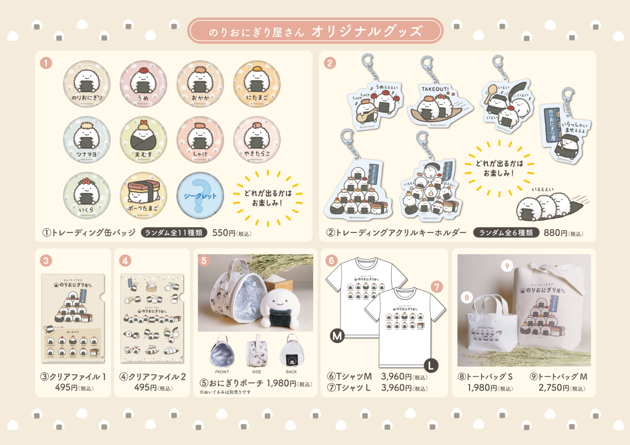 Onigiriyasan’s exclusive Nendemo Ikimono merchandise includes buttons, keychains, file folders, T-shirts, tote bags and plushies featuring the onigiri character. Customers are limited to buy up to 11 trading buttons and up to six acrylic keychains.