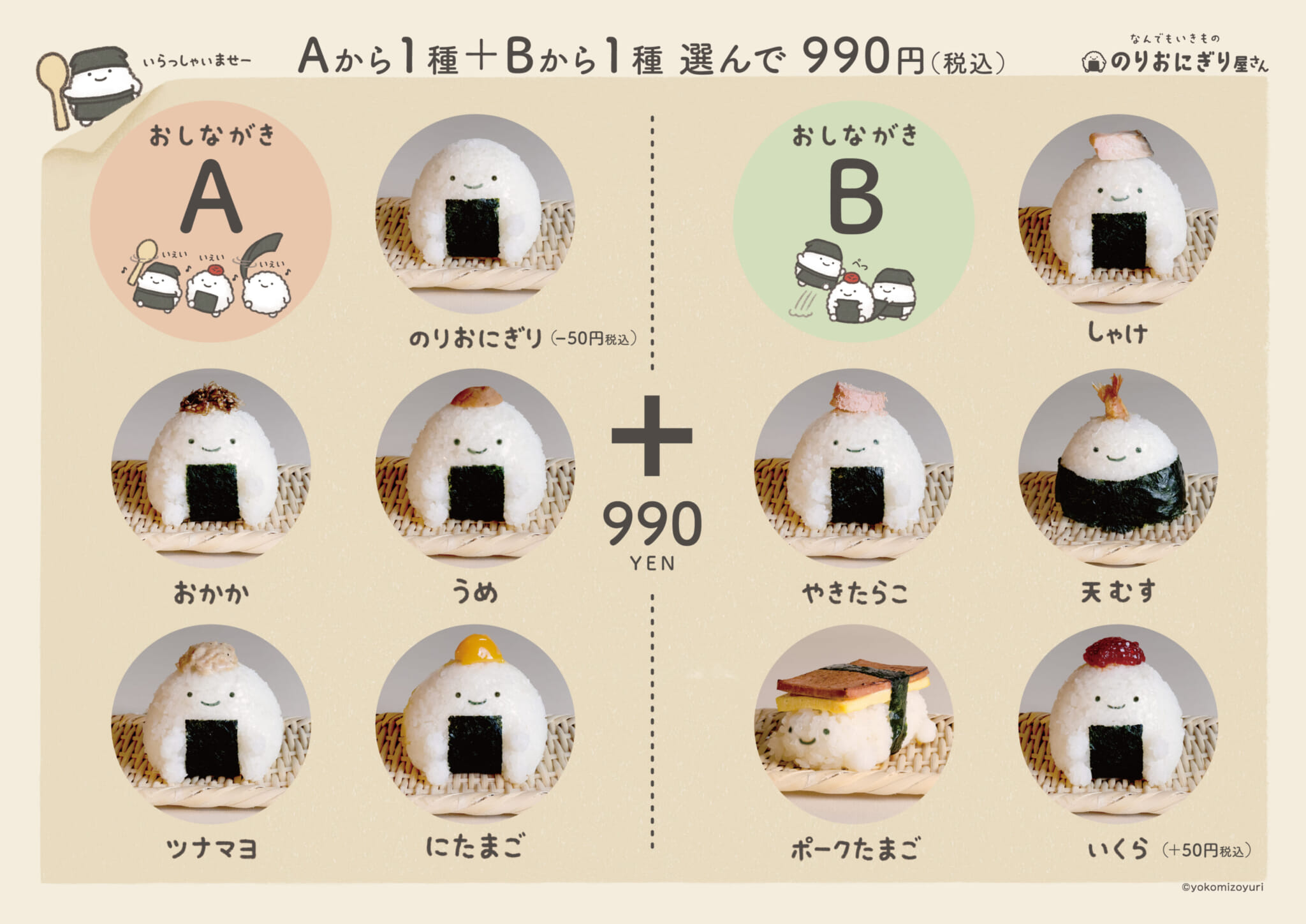 The menu is divided into two sections, A and B. Customers can select one onigiri from the A selection and one onigiri from the B selection for ¥990. Toppings include pickled plum, tuna mayonnaise, salmon, tempura shrimp, egg and salmon roe. Customers are limited to ordering six onigiri (3 sets) per person per transaction.