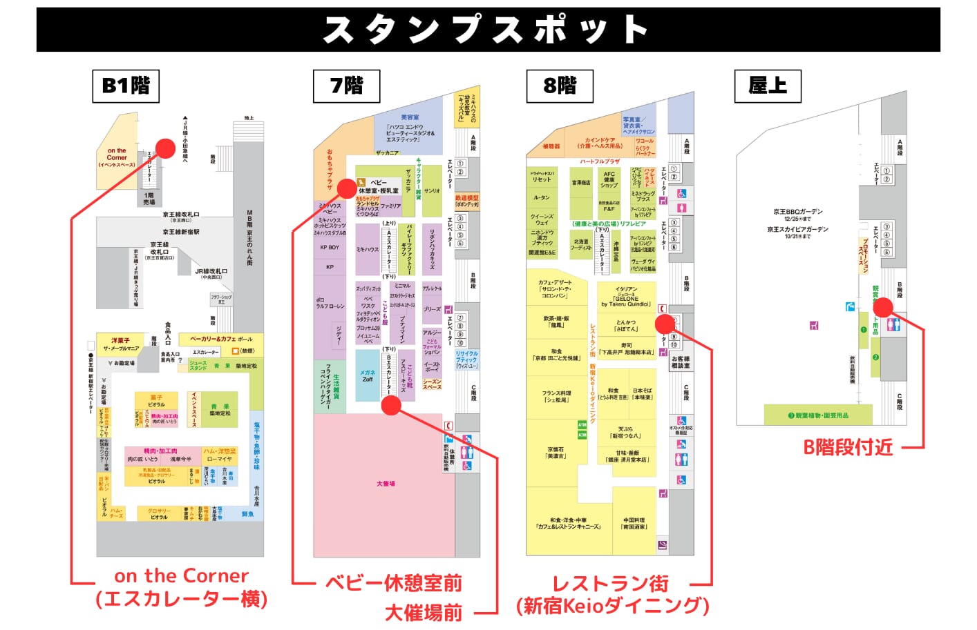 Various character displays are scattered throughout the Keio department store. Take photos with them, and scan the QR to collect stamps in a digital stamp rally. Collect three stamps to receive a gift exchange coupon.