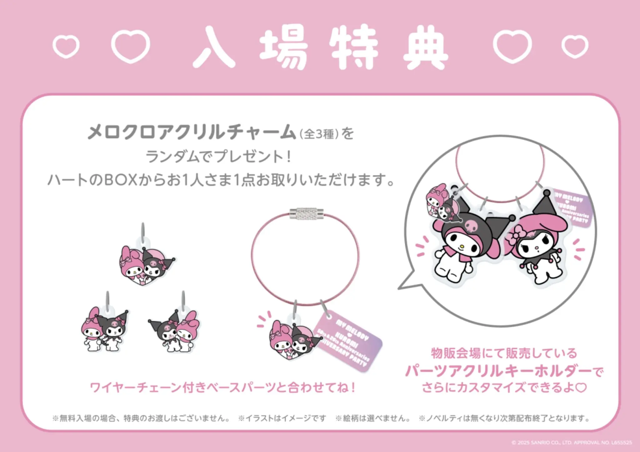 Guests will each receive one random acrylic charm featuring My Melody and Kuromi from a mystery box. A wire chain is available at the gift shop to turn the charm into a collectable bracelet.