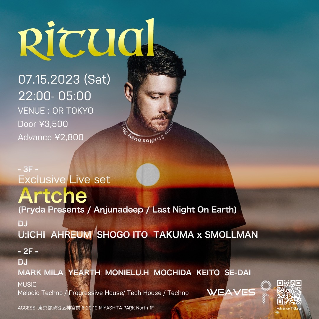 The new melodic party Ritual at Or combines great DJs and art. There will be a special live set by Artche (stylized as Ar t c h e), a DJ from the UK. The domestic performers who will be supporting him include U:ichi (stylized as U:ICHI) and Ahreum (stylized as AHREUM). U:ichi organizes the party Weaves, while Ahreum has been described as one of the top female melodic artists in Japan. There will be many other performers too, both on the third floor and the second floor, all playing melodic techno, progressive house and tech house.