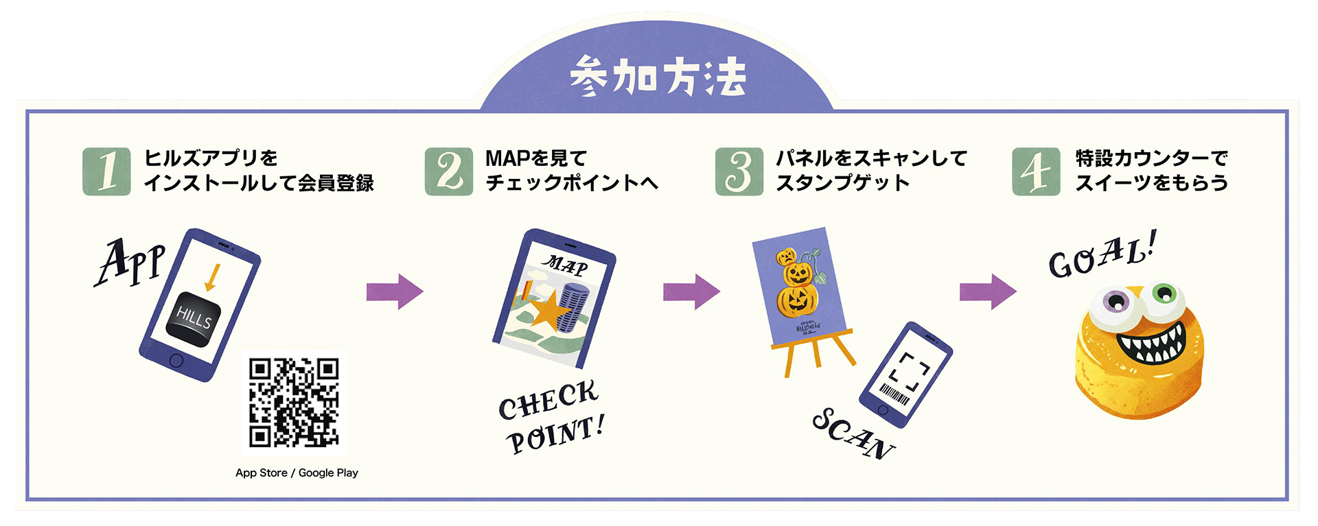 With the Hills app, participants can collect digital stamps to receive a special treat. To get started, download the official Hills app and complete membership registration. Then, locate the three stamp checkpoints scattered throughout the area and scan each QR code with a smartphone camera. Once you have collected all three stamps, come to the special rally counter on the second floor of West Walk to receive a Halloween pumpkin cake courtesy of Grand Hyatt Tokyo Fiorentina Pastry Boutique.