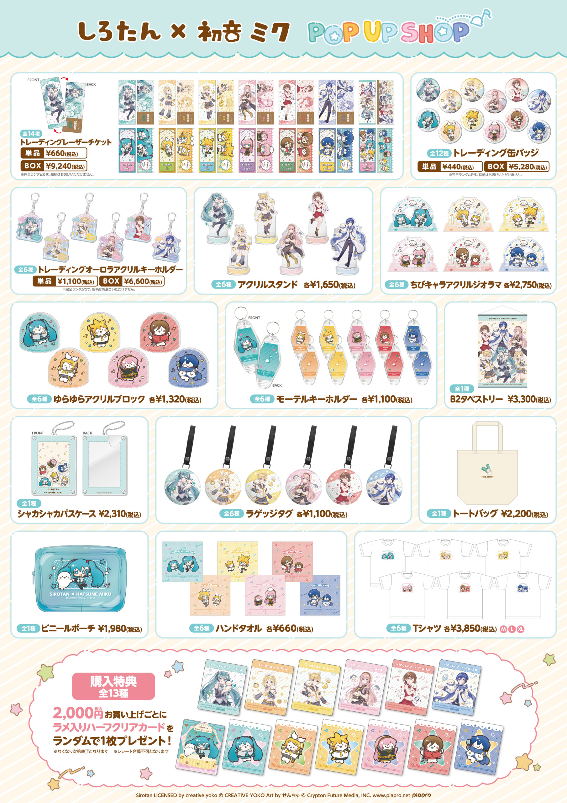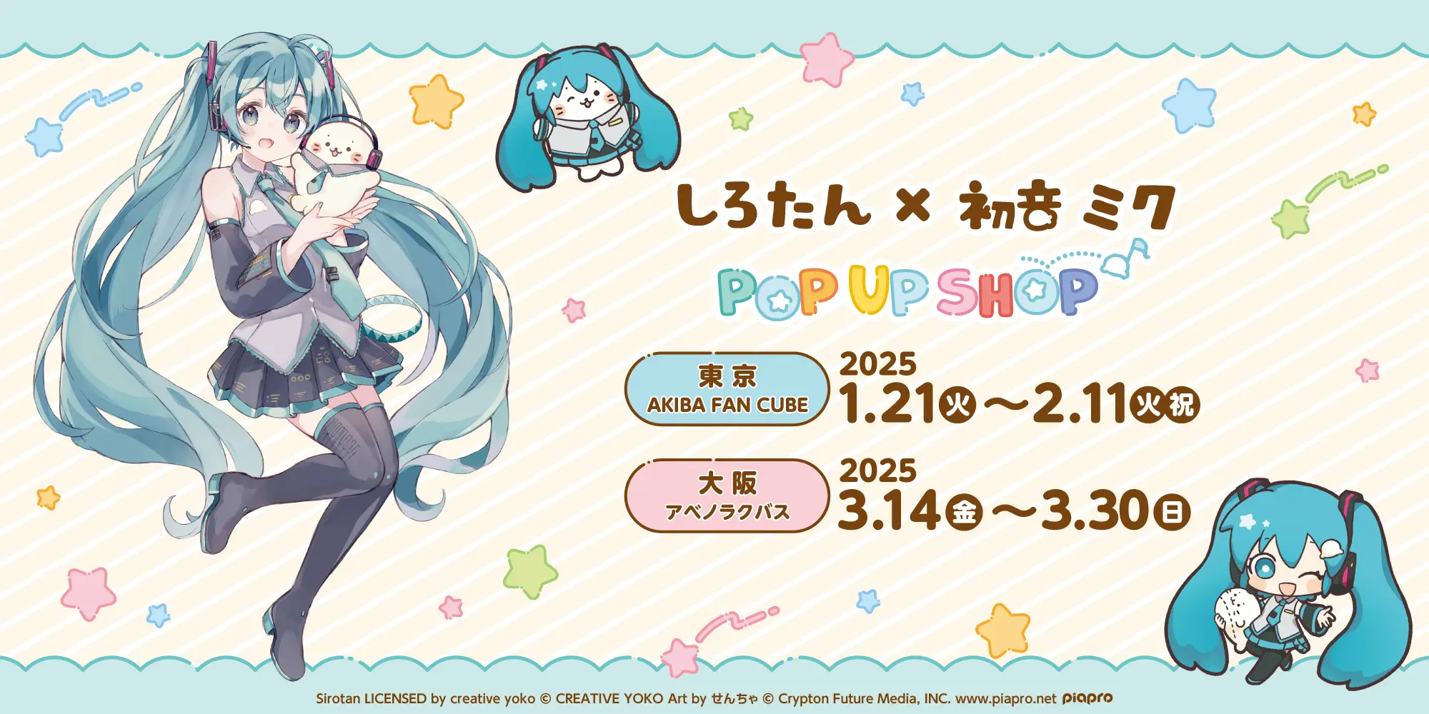 For a limited time, a pop up shop will open in Tokyo and Osaka with exclusive merchandise and a special exhibition featuring the characters. The collaboration artwork features Sirotan and the main six Vocaloid singers Hatsune Miku, Kagamine Len, Kagamine Rin, Megurine Luka, Kaito and Meiko.