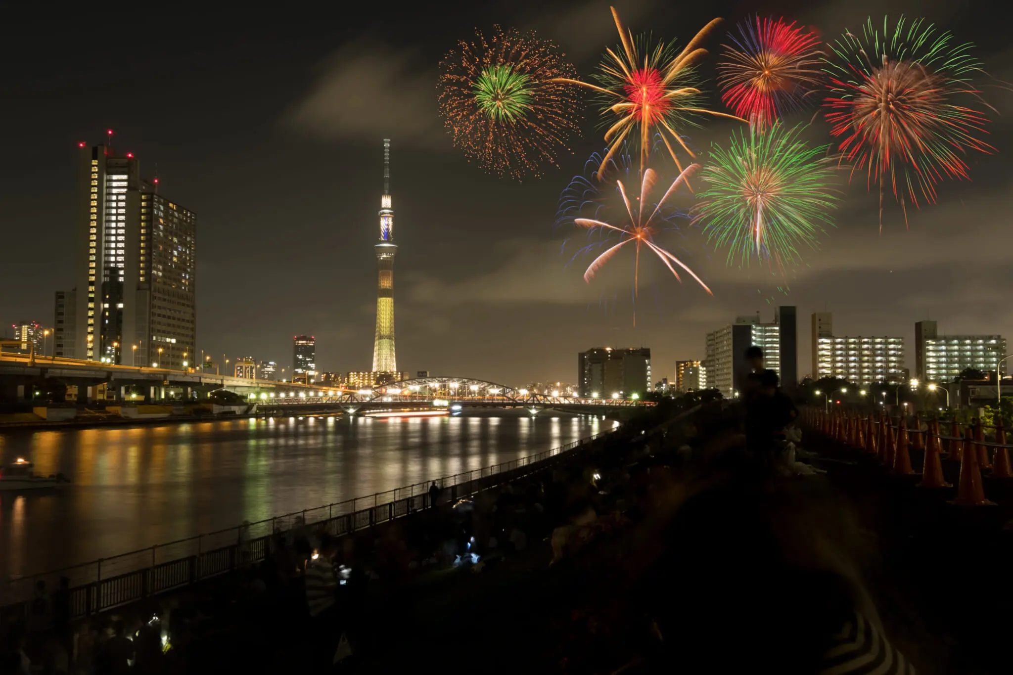 The Sumidagawa Fireworks Festival, which clocks in at 90 minutes in length, is one of the largest fireworks festivals in Tokyo. The origin of this festival is the Ryogoku no Kawabiraki Hanabi, which started in 1733 as a memorial event for those who perished during a famine and disease outbreak the year before. The festival, which combines the sophisticated skills of pyrotechnicians with the emotional landscape of old Tokyo, features dynamic performances by fireworks artisans.