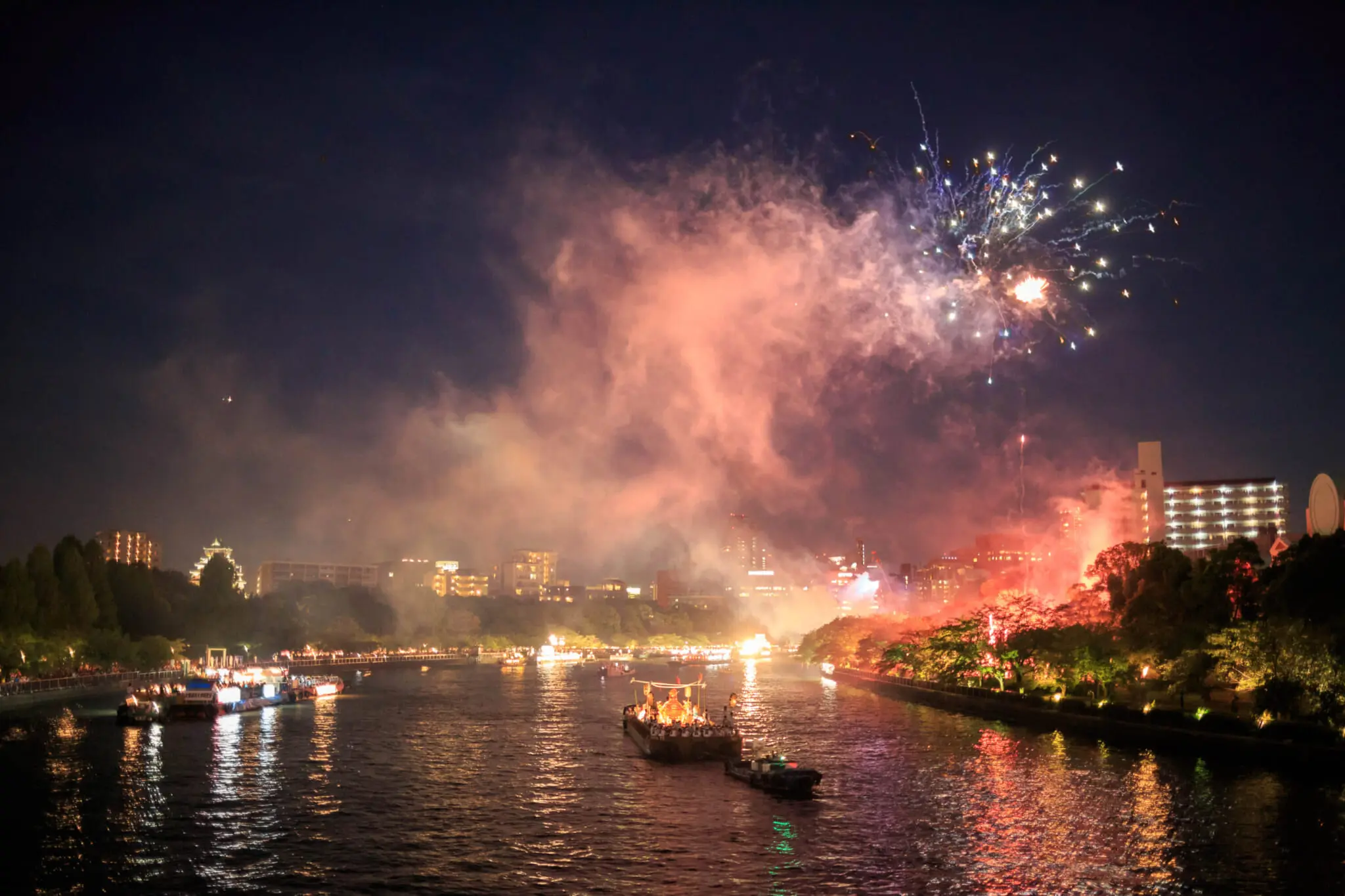 Every year, the festival’s original kobai (red-blossomed Japanese plum) firework, which opens in the shape of the ume-bachi family crest, is launched in honor of Tenjin-sama, the patron deity of scholarship and learning. There are also many other unique fireworks to be enjoyed throughout the fireworks spectacle.