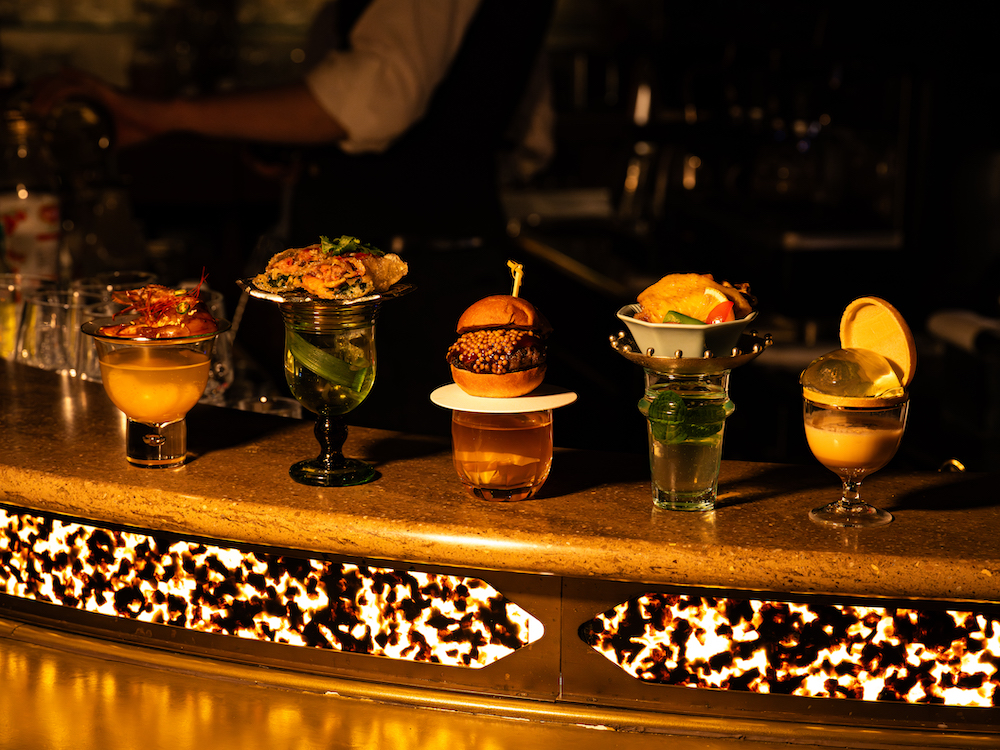There are five types of cocktails, each paired with palm-sized appetizers inspired by five countries around the world, including a soy sauce marinated shrimp dish paired with a soju and mandarin juice drink from South Korea, a mini-burger and bourbon whisky-based cocktail from the US and a tagine dish and vermouth cocktail from Morocco.
