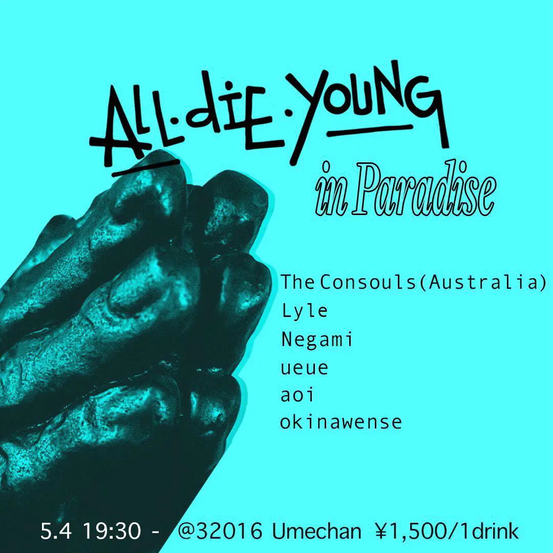 All Die in Paradise is a party organized by All Die Young, based in Sangenjyaya, and Paradise, based in Koenji. All Die Young has been active since 2015 and focuses on crossover styles and genres based on the experience of organizer Aoi, a dance music DJ and a music journalist. Paradise mixes live music and DJs with various backgrounds and was started in 2022 at Studio Dom by DJ Okinawense who has roots in Okinawa and Koenji.