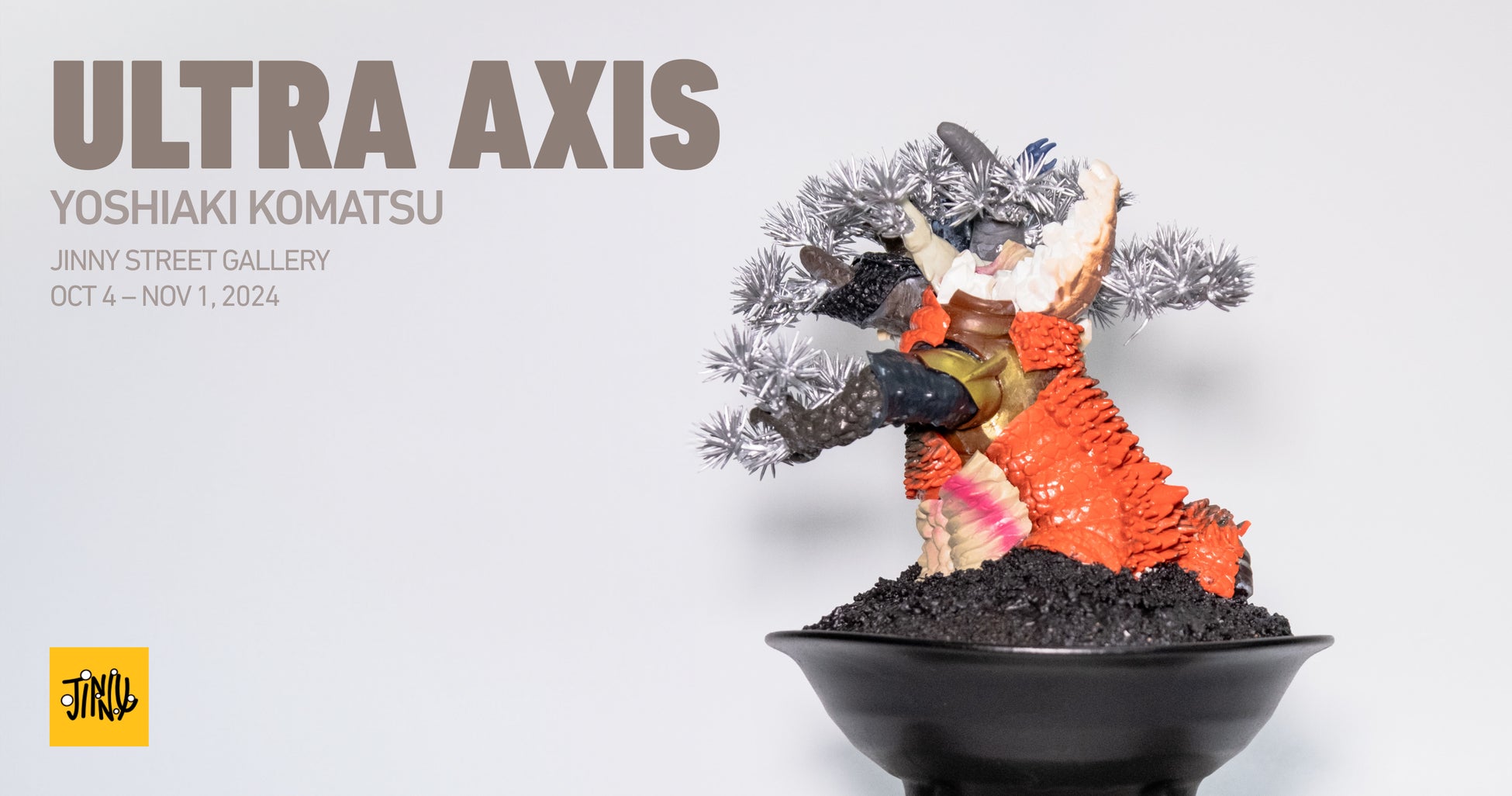 Komatsu Yoshiaki is redefining the traditional Japanese art of bonsai with his innovative exhibition, ULTRA AXIS, held from October 4 to November 1 at Jinny Street Gallery. Known for deconstructing and reassembling objects into new artistic forms, Komatsu draws inspiration from kaiju — Japanese monsters with dramatic features — to create a bold fusion of traditional bonsai and imaginative monstrosity. His new vision emerged from observing the expressive shapes of plant trunks, which he likened to living creatures, sparking his exploration of how natural forms could intertwine with the fantastical world of kaiju.