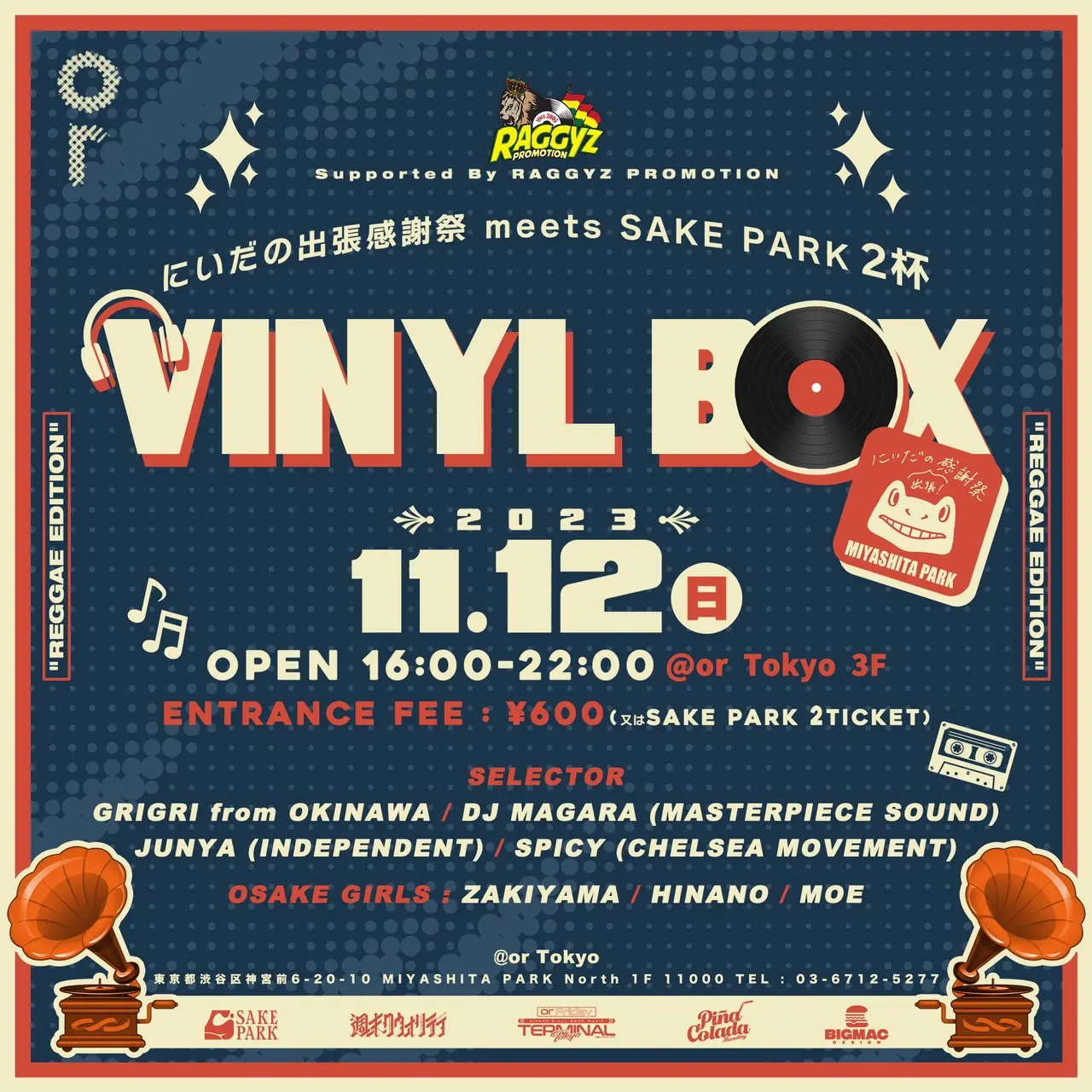 Join the team at OR, Miyashita Park, for an evening of good tunes, good drinks – associated with the Sake Park event– and excellent vibes. With tracks from Grigri from Okinawa, DJ Magara and others, this Reggae Edition evening is the perfect solution to any of your Sunday blues.