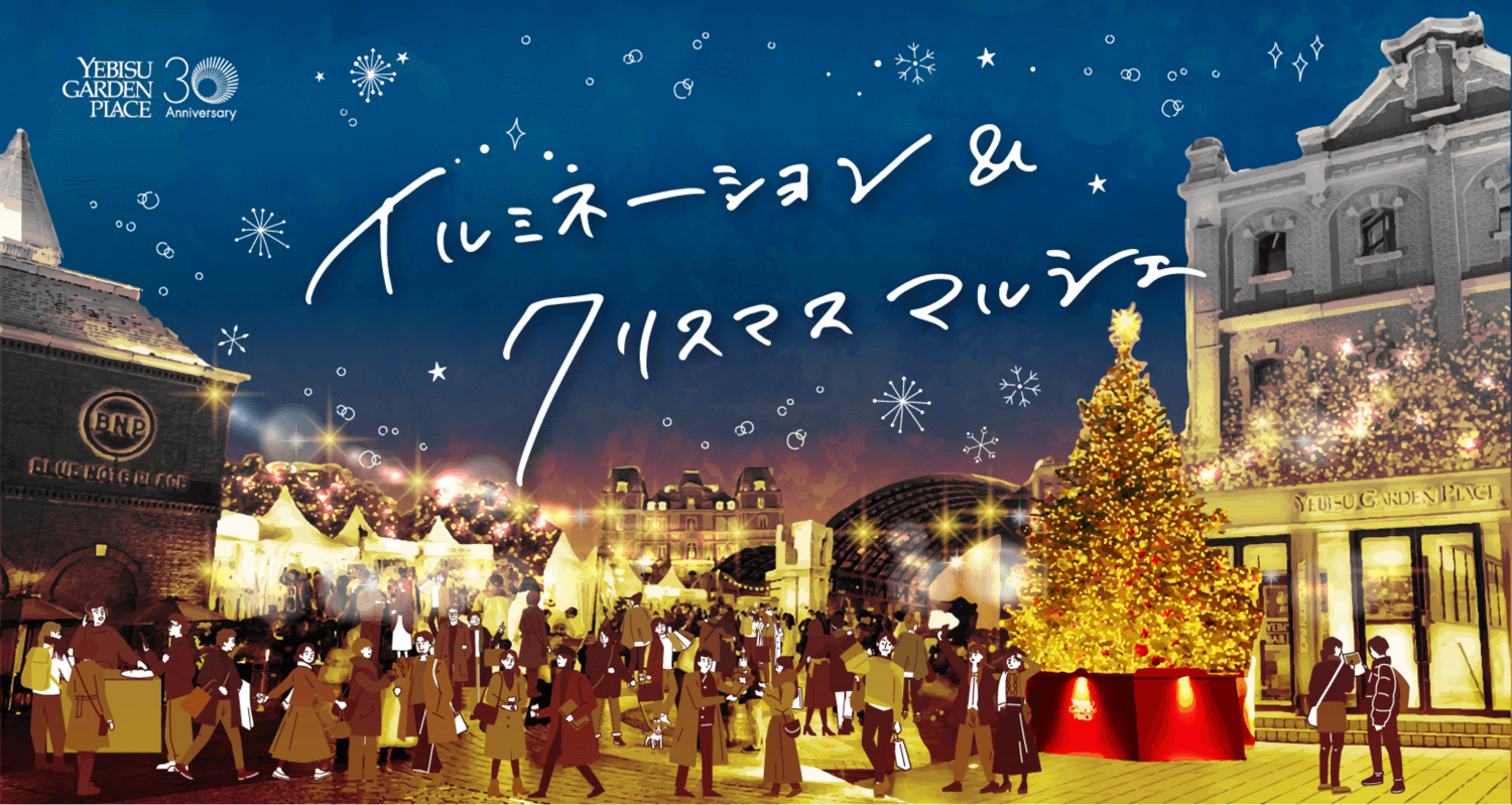 Yebisu Garden Place is celebrating their 30th anniversary and the holiday season with a special illumination display. The lights along the promenade lead to Clock Square, where a 10-meter Christmas tree decorated with over 300 ornaments stands. Over 100,000 champagne gold light will light up all over Yebisu Garden Place.