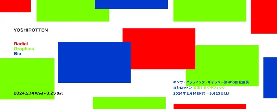 A solo exhibition exploring the archives of designer Yoshirotten. Based around the theme of RGB, the color model used by screens, ‘Radial Graphics Bio’ is a kaleidoscopic showcase of logos, typefaces, spacial design and video from the Tokyo-based graphic artist.