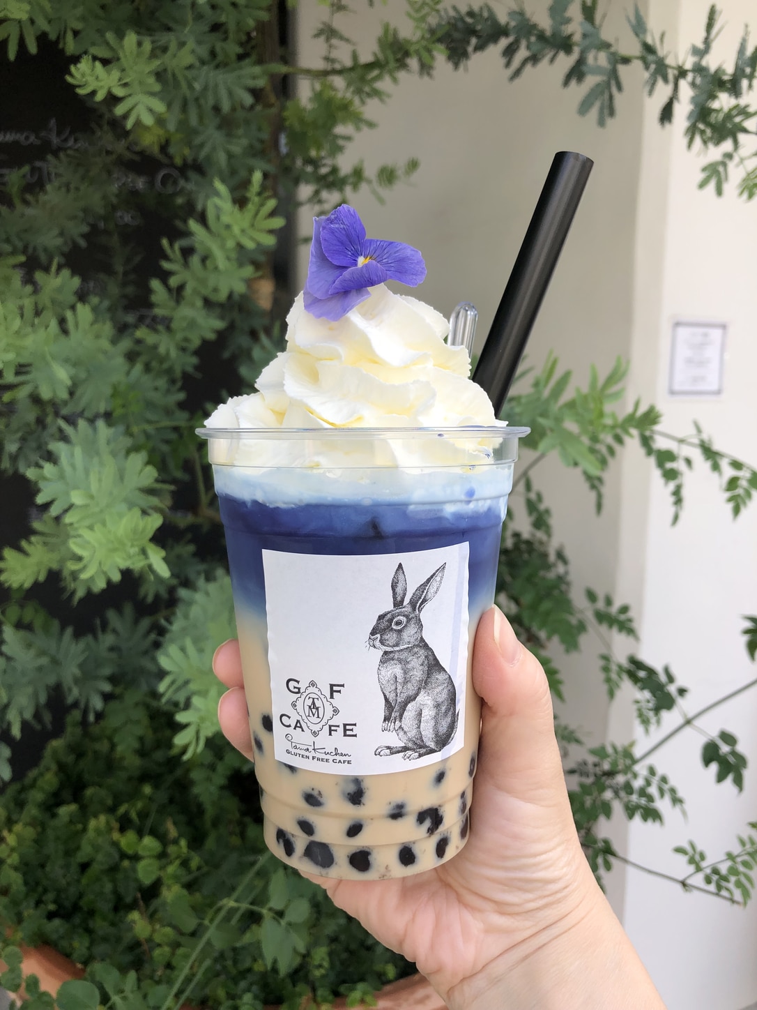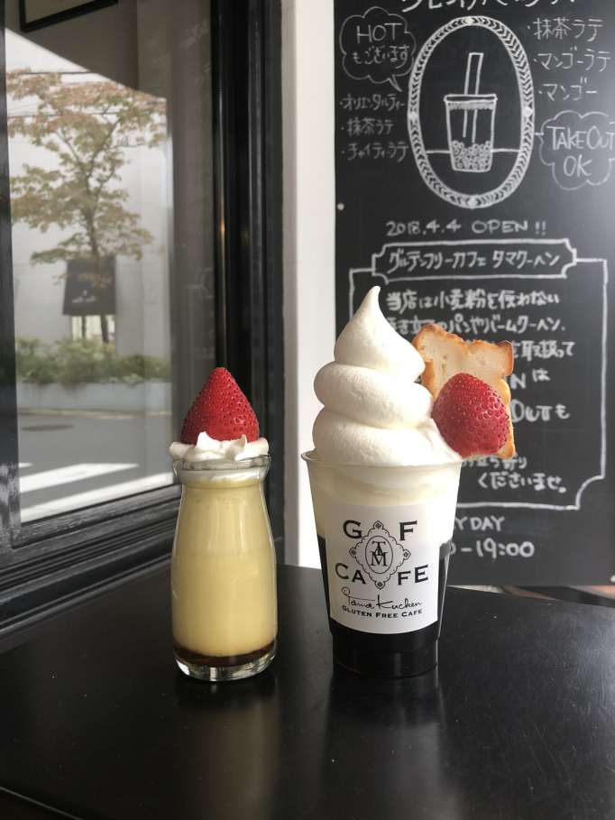 Tama Kuchen Café is cozy and inviting. On top of that, their gluten-free sweets and drinks are Insta-worthy with bright colors, berries and flowers. Diners can order gluten-free boba drinks, which are very difficult to find in Japan. They also usually serve gluten-free beer, although not during the state of emergency. Their bread and Baumkuchen can be ordered online.