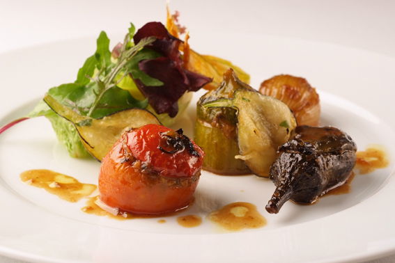 I started with a light pastry complemented by a delicate white wine. The main course was the chef’s recommendation, local vegetables stuffed with veal and mushrooms, a speciality based on the natural style of cooking around Nice, where Kojima previously worked. A lightly dressed salad of fresh greens, including roquette, offset the summery plate. The chef insisted I try his all-wheat bread, freshly baked of course, which was wonderful and almost too hot to touch.