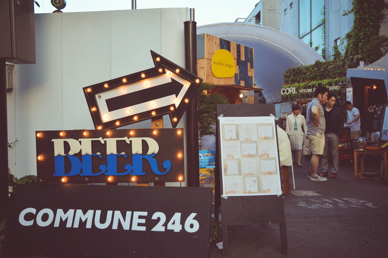 Vintage lighting and decorations, hanging vines and overgrown wildflowers, wooden benches, and antique aluminum food carts make for an atmosphere that feels like a small southern U.S. town in summer—even though it’s just steps away from one of the Tokyo’s busier streets. Members and directors of Commune 246 have designed the space meticulously, adhering to their three principles of “Freedom, Random, and Wisdom.”