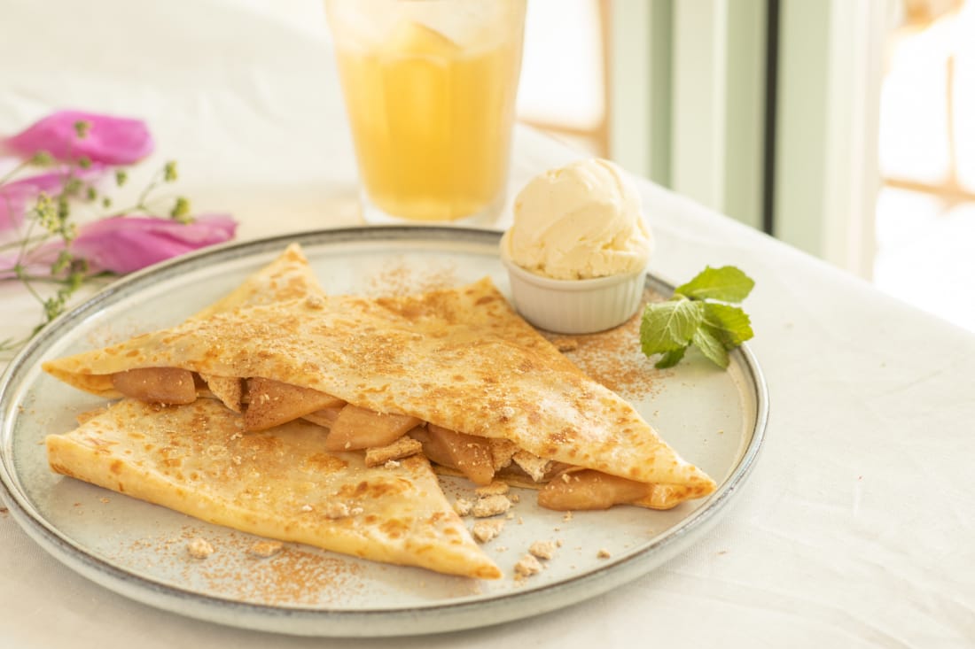 Consider splitting your meal between savory and sweet plates. Imports from Hawaii include Banana Split, which revises the famous dessert by adding macadamia nuts and Hawaiian sea salt caramel. The Temptation in Paradise riffs on another American confection: this crepe, with apples baked in brown sugar and cinnamon, is topped with graham crackers and vanilla ice cream.