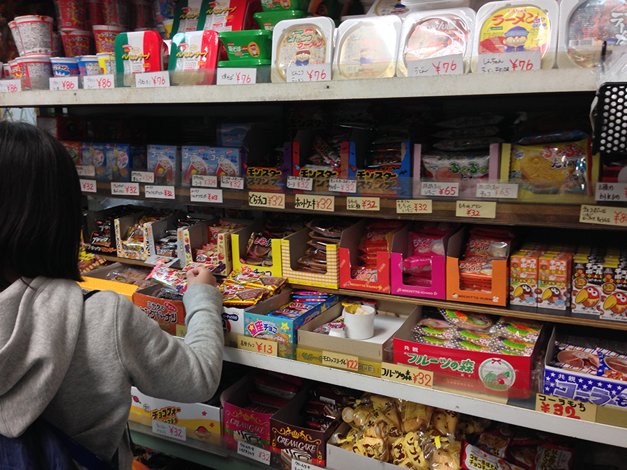 The shop selection includes more traditional flavors, like umeboshi (pickled plums) ika senbei (squid flavored crackers) or kinako dango (roasted soybean-flavored dumplings on a stick). There are also things more familiar to westerners, such as chips, chocolate, gummies and jerkies of all kinds – even mini-donuts! Other items are geared toward kids: toys and novelty items such as candy cigarettes, stamps and stickers.