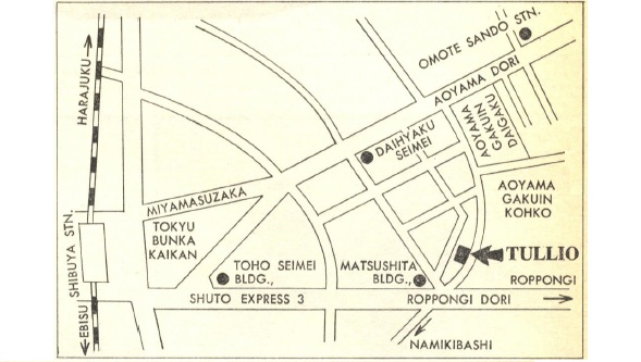 Tullio is not far from Roppongi-dori, but we got there by driving up Route 246 toward Shibuya and taking the first left after passing Aoyama Gakuin. We had almost reached Roppongi-dori before we saw the restaurant sign prominently displayed from the Kinsei Building.