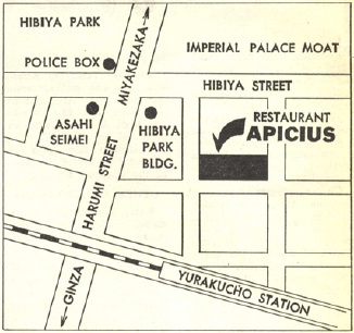 A word about its wines, which are kept under excellent conditions in its long, six-ticred cellar: Apicius has a great list that has selections of wine from Bordeaux, Burgundy, Rhone, Loire, Alsace and even a still Champagne, as well as representatives of all the great vintages from the late ’50s on. Some of the prices are discouraging, though not out of line with the Japan wine world. How about a Chateau Mouton Rothschild, 1961, for ¥160,000?