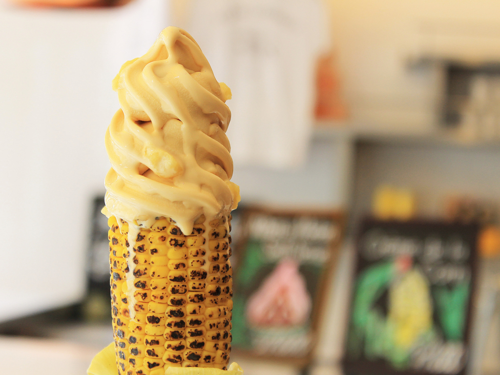 We launched the Crème de la Corn last year after going to Tsukiji Market, and seeing that sweetcorn was right on season in the summer. So we decided to grill it with soy sauce, which is a very Japanese way of eating corn. And we decided to put caramelized corn ice cream on top. I like ice cream that is not always on the cone or cup, so putting it on top of an actual corn is a very fun way of eating it.