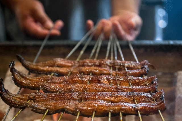 Given how particular the eel are about where and when they reproduce, it seems only fitting that the cooks at the Nagoya-based Hitsumabushi Bincho franchise prepare them with the same attention to detail. As Takashi Ibuki, head chef and chef trainer for the franchise, explained, there are many different details that must be considered when preparing an eel on the grill. And the grill is one of the things that separates Nagoya-style eel from the way it is prepared in other parts of Japan. Particularly around Tokyo, it is served steamed, which makes for a softer dish, but one with far less character. All it takes is one bite of grilled eel to be able to tell the difference. There’s a crunchiness in the beginning that makes for a firm, yet juicy consistency that is complemented by the rich sweetness of the kabayaki glaze. Finally, the oak grilling leaves its final mark on the dish: a smoky aroma that lingers on pleasantly.