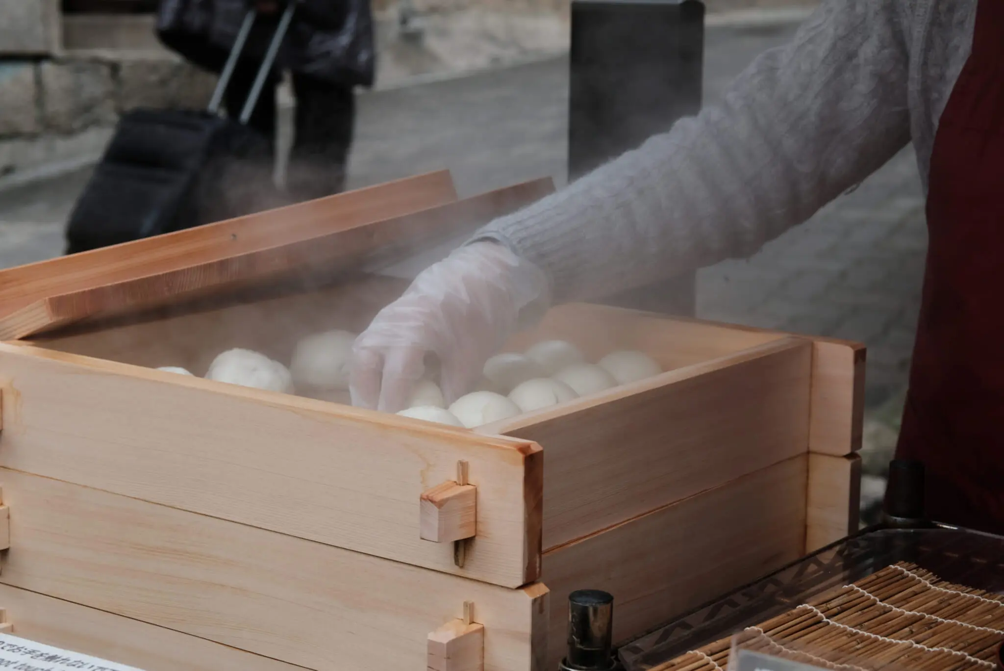 These tiny, filled buns, found in souvenir shops across the country, take on a whole new life when it becomes cold. Heated in special bamboo steamers, the manju are heated with steam from hot spring water. Peddled on shopping streets in onsen towns country-wide, take a stroll around with an onsen manju in one hand and a cup of steaming amazake in the other.