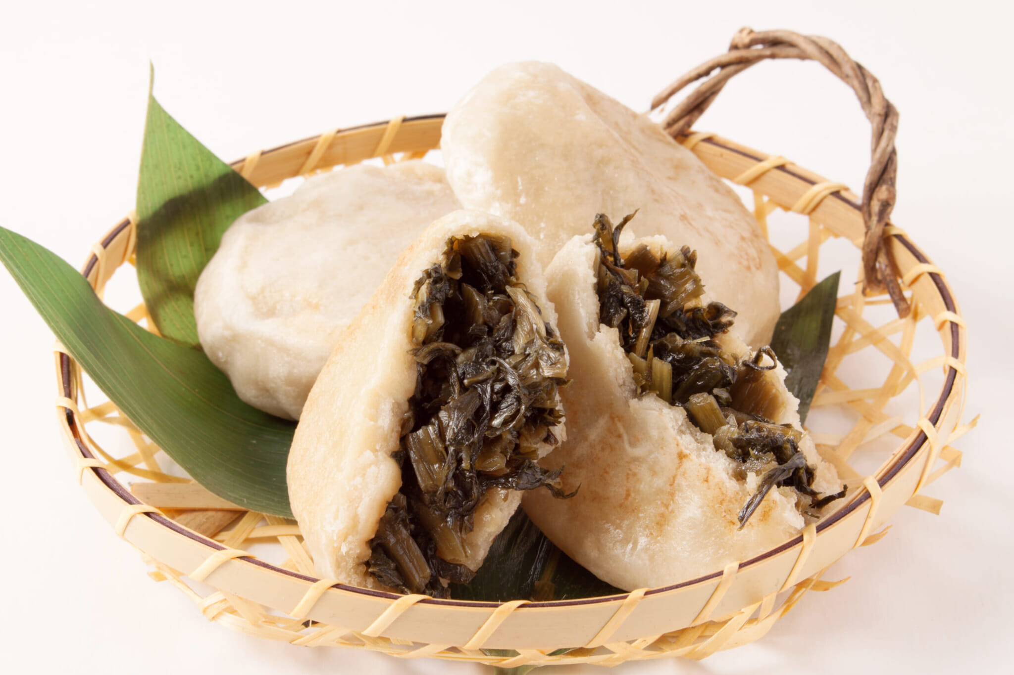 Common at food stands in the countryside or onsen towns, oyaki is the native Japanese version of the aforementioned man. Flatter and heavier than the fluffy steamed buns, oyaki are flattened and filled dumpling buns. Containing a sweet or savory filling, oyaki originated in the snowy prefecture of Nagano. The fillings are typically rich and flavorsome. They tend to be vegan, and can include Nozawana leaves, kabocha (Japanese squash) or adzuki beans.