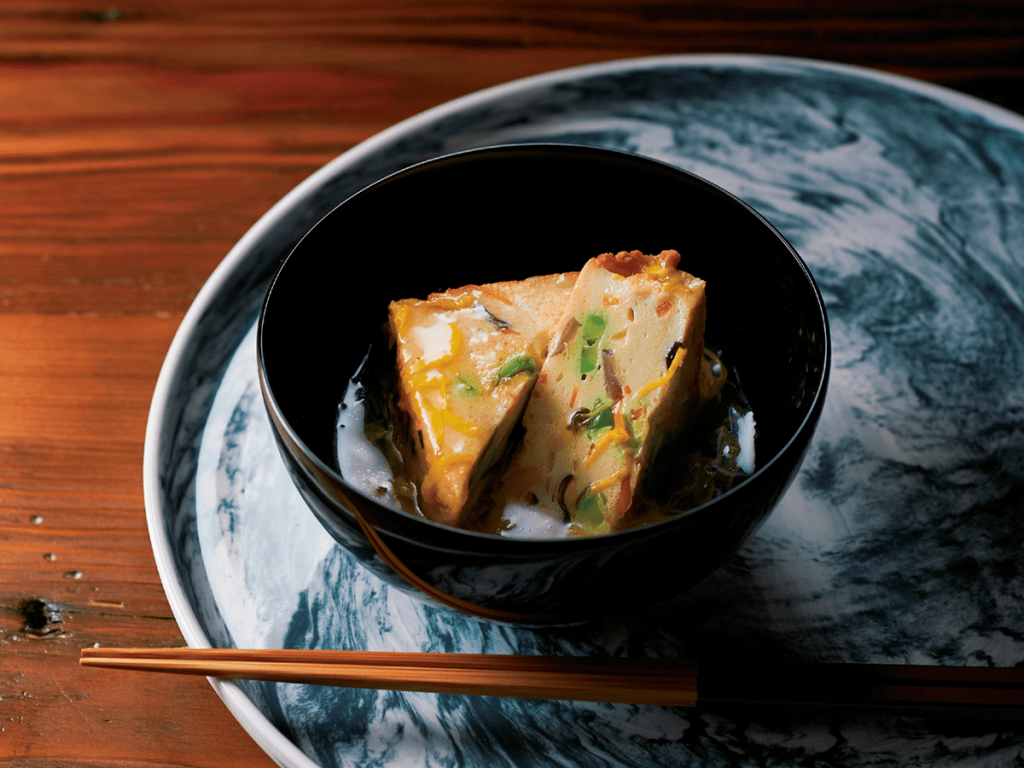Main Image: Townfolk in Edo cooked tofu in various ways and they put 100 recipes into the book “Tofu Hyakuchin.” Kakuhiryu-zu is one of the recipes and it will be arranged with “Kikuka-ann,” the thick sauce with shredded chrysanthemum sprinkled. Kusatsutei, a retailer within Mitsukoshi Nihombashi, will serve deep fried tofu mixed with vegetables and minced fish for ¥324. Photo supplied.