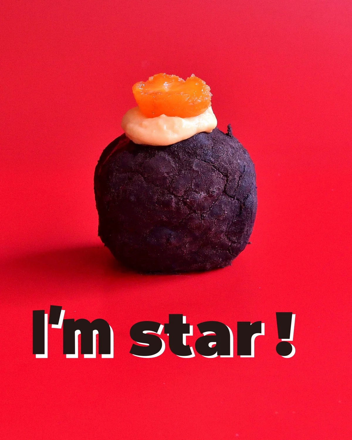 - I’m Star! – a black cocoa chocolate donut filled with cream and homemade custard and chunks of juicy figs, topped with a candied egg yolk