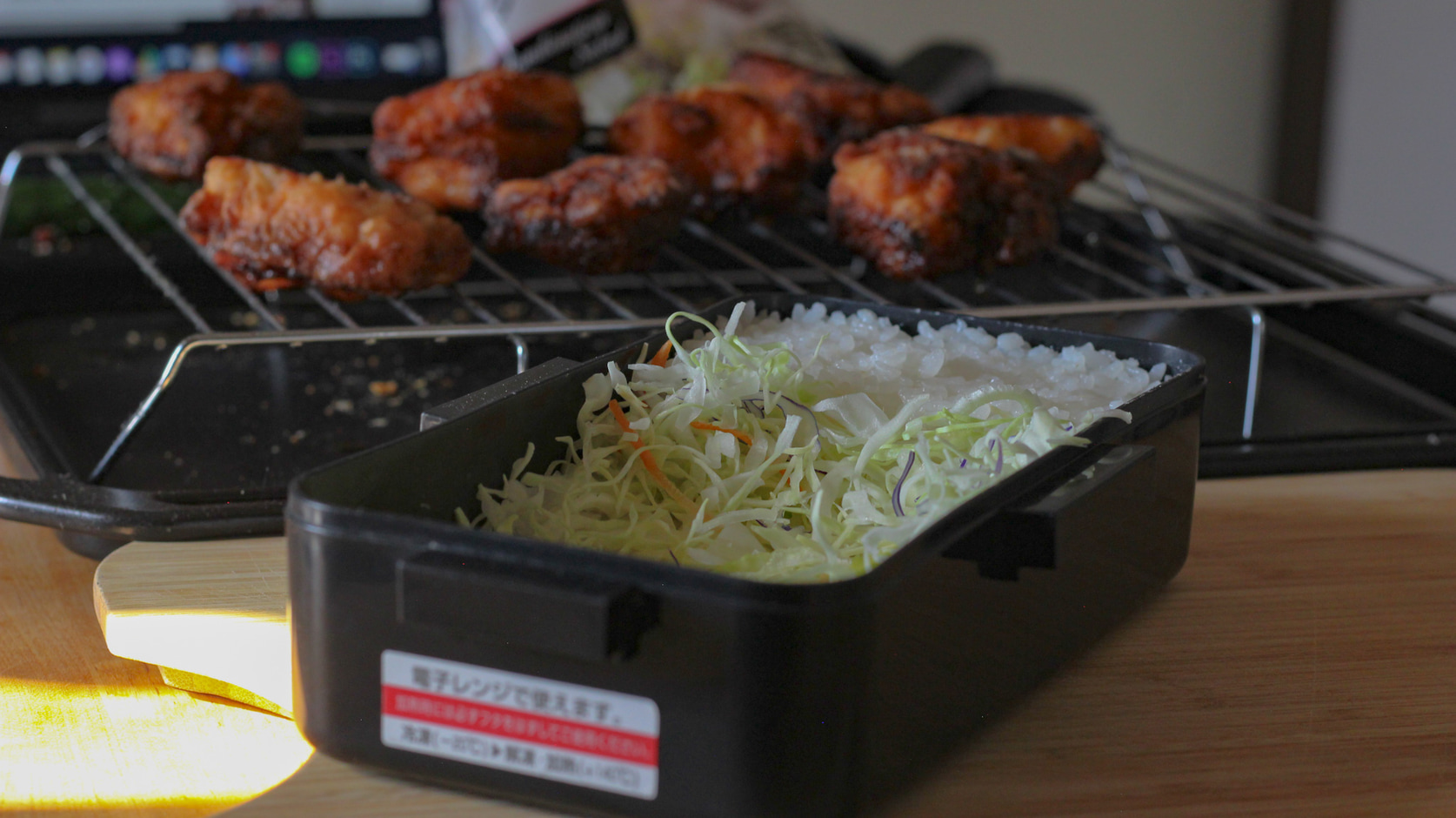 Just like the double-decker bento box we want a for the bento to look good but also be a well-balanced meal. This time we’re going to use shredded cabbage to secure our karaage. It gives us a nice green hue and also stops the karaage from rolling around as we place the rest of the ingredients in.