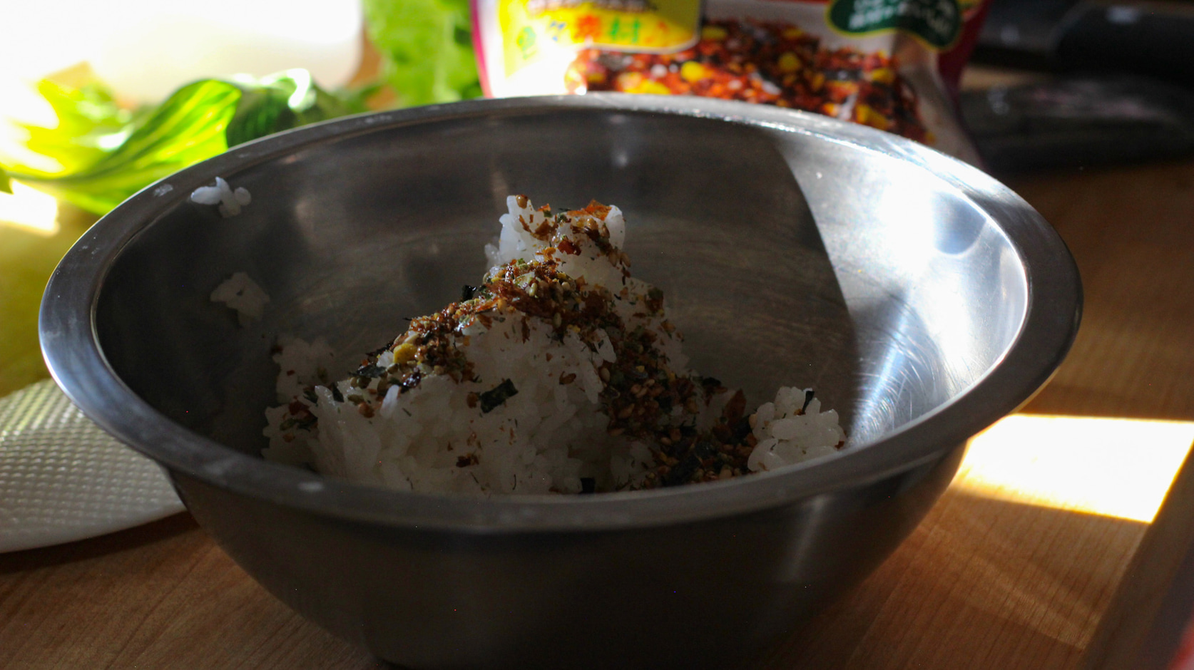 The onigiri is a blank slate and one is always free to experiment with different fillings and spices but for this bento, a tuna-mayo, simple salt and then finally a furikake, or Japanese rice seasoning, onigiri is perfect for the color balance I’m looking for.