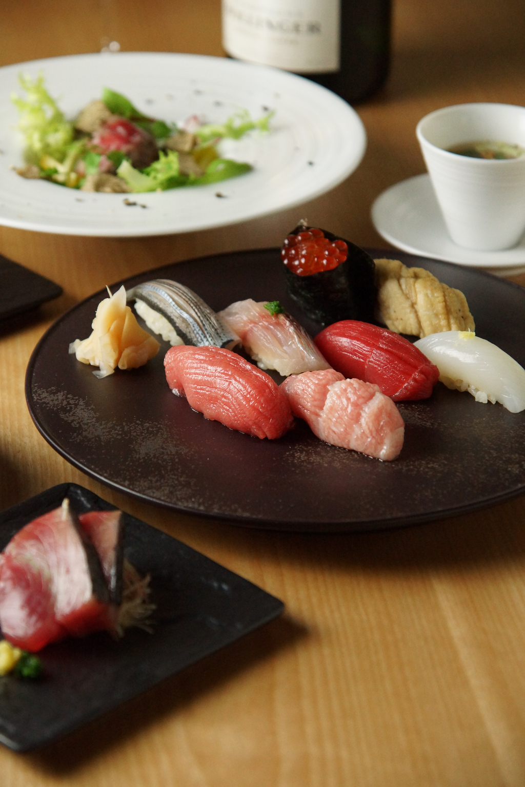 Before the main course, we were treated to an exquisitely presented minced waygyu beef salad and a glass of Marsannay 2013; a ruby colored wine with a lot of substance. It was then time for some sake to drink with the main course; seven different types of sushi all served separately. From the golden cuttlefish to the rolled salmon roe it was some of the best raw fish we’ve ever experienced.