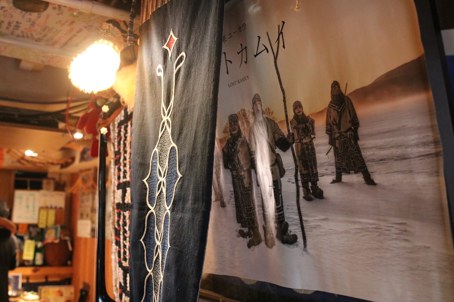 Harukor is tiny, just five tables huddled together and a small open kitchen. But that’s not rare in Tokyo. Every inch of space is used, the walls are adorned with Ainu traditional patterns as well as pop culture depicting Ainu culture such as the widely popular Golden Kamuy manga and the autograph of the mangaka who created it. The music in the background is always by Ainu artists.