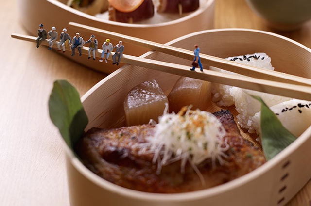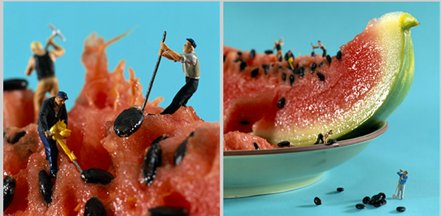 With more than a decade’s experience of creating illusions of mini figurines with fruits, pastries, cheese, nuts, and anything else you can think of, the artistic pair, calling themselves Minimiam– meaning “Mini Yum” in French—have constructed over 100 intricately designed scenes.