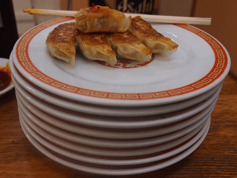 They come five to a plate, and the system at the restaurant is simple: you have to order at least two plates if you sit down at the counter, or one of the few table seats. After that, they keep bringing you plates until you say stop – and to keep things moving, they’ll ask you once you’re down to about two or three gyoza on the plate you’re working on. Each time you get a new plate, it’s stacked on top of the ones before it. Depending on your personality type – and just how hungry you are – this can lead to unspoken, friendly competition as you eye the stacks of plates of other diners sat around the snug counter, and think about ordering just one more plate of five.