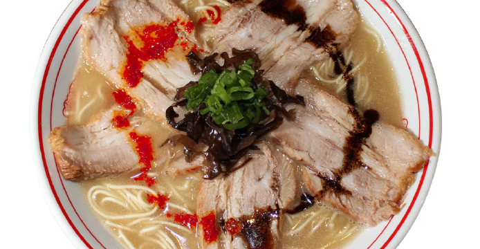 One of the most popular types of ramen in Japan, the main characteristic of Hakata ramen – from Fukuoka/Hakata in Kyushu – is its thick, white soup made from pork bones and its ultra thin, firm noodles. Pickled red ginger, benishoga, is a popular (and optional) garnish.