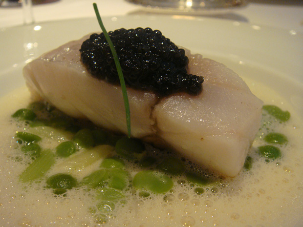 The next dish, roasted langoustines with wild morel mushrooms, was quite simply one of the most exquisite, delicious dishes I’ve ever tasted. The langoustines were cooked to perfection, slightly translucent in the center and just barely cooked through so that the flesh would not be victim to the rubberiness that can result from overcooking. The morel mushrooms were earthy and luxurious, and imparted an addictive savoriness to the foamy butter broth. The flavors of the langoustines, mushrooms and broth each shone through individually, yet also came together in a singularly amazing melody of savory flavors.