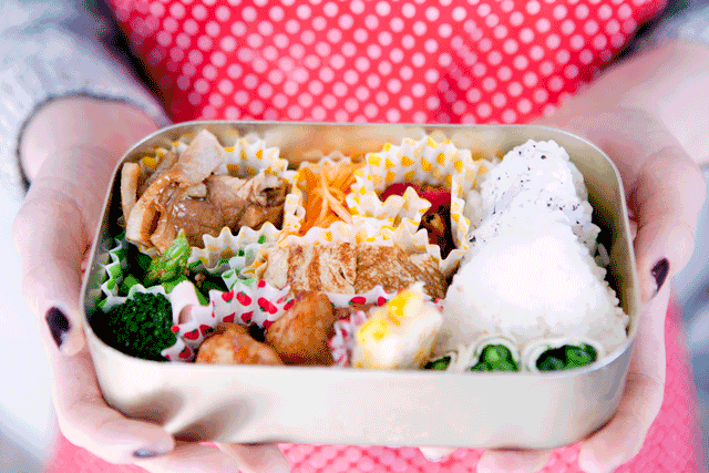 It doesn’t stop there, of course. Although there’s plenty of freedom for what you put in, a well-balanced bento contains fresh, seasonal ingredients and presents four colors of side dishes—red, yellow, green and brown—and white for rice, noodles, or bread. A good rule of thumb is to fill half of the bento with rice and half with side dishes. Any gap should be filled so everything is kept together tightly and doesn’t shift in a bag on the way to school or the office. In other words, form and function are as important as nutritional value.