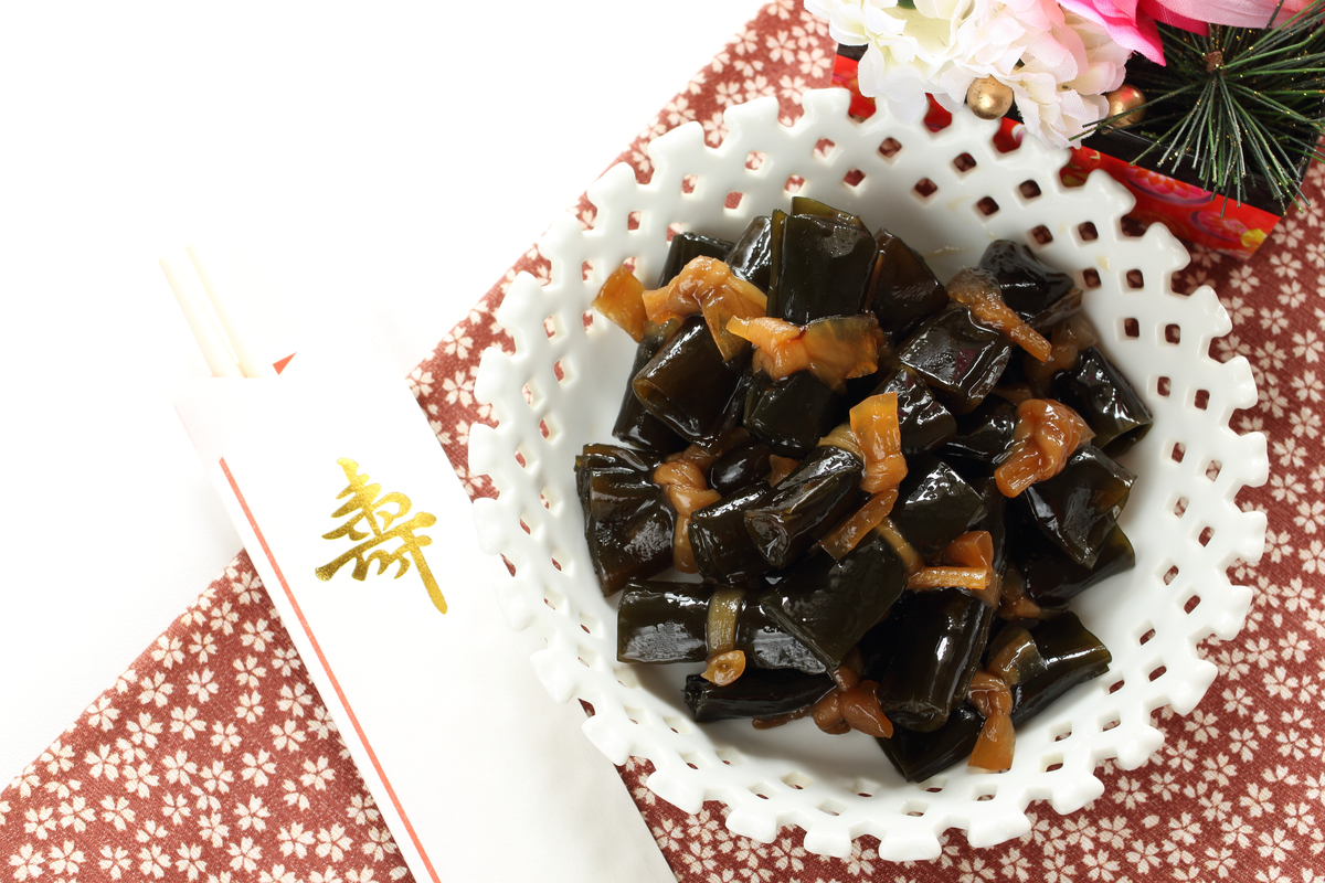 This is a type of seaweed, and this word is closely connected to the word yorokobu, or happiness, which is what this food is meant to bring in the New Year.