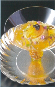 Just before rice and dessert, our waiter happened to mention that there were two Japanese-Western dishes on the a la carte menu that were especially popular with foreign heads of state and other VIP guests staying at the Akasaka Guest House. Of course my interest was piqued and I just had to order these as well. The sea urchin pudding with consommé jelly (¥2,310) came topped with caviar, in a wide cocktail glass on a silver plate ringed with lavender flowers. My first spoonful yielded only a slight sweetish flavor, but the succeeding ones brought out the kind of refined taste that grows on you. The tartare mille-feuille with fruit tomato (¥1,680), another favorite of presidents and royalty, resembled a cake of strawberries but was actually crab meat mixed with olive oil and topped with spicy tomatoes. While this may be more Western than Japanese, it was certainly tasty.